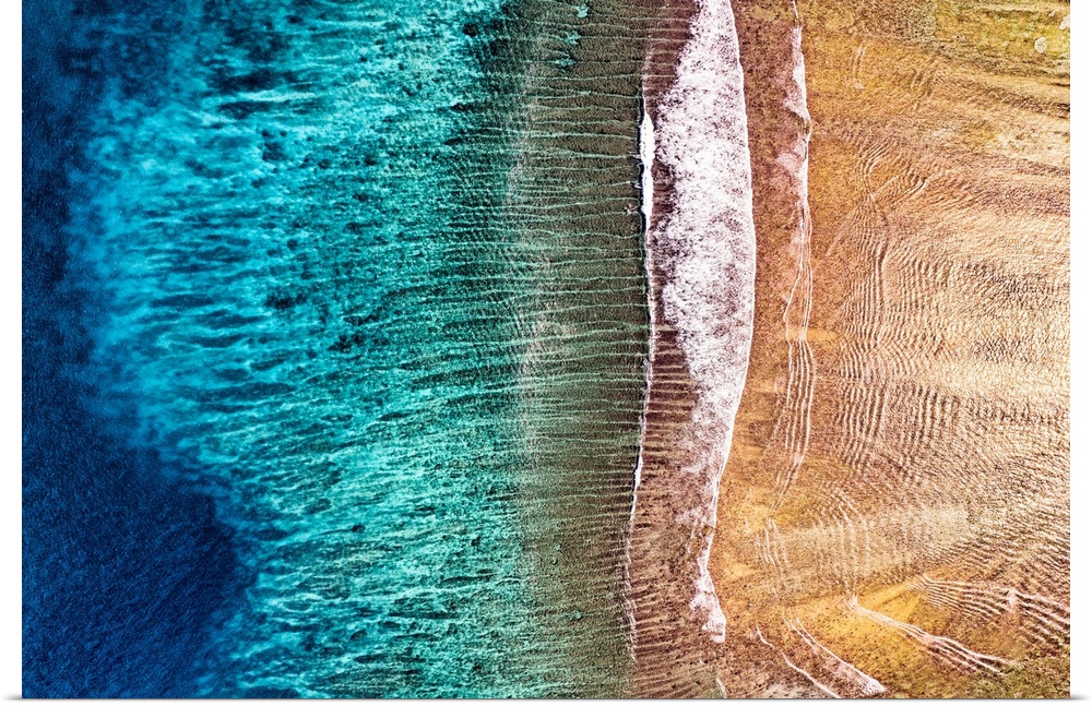 <p>A stunning overhead aerial photograph of slow waves receding from a sandy beach, it resembles an abstract painting</p>