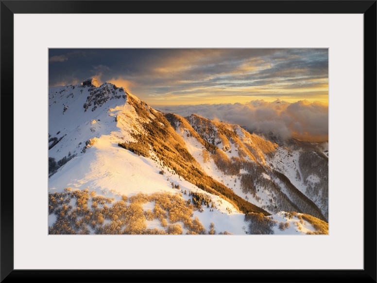 <p>aerial sunset in winter time taken by drone of Gendarme Mountain, Tuscan-Emilian Apennine National Park, Sassalbo, municipality of Fivizzano, Massa Carrara province, Tuscany district, Italy, Europe.</p>