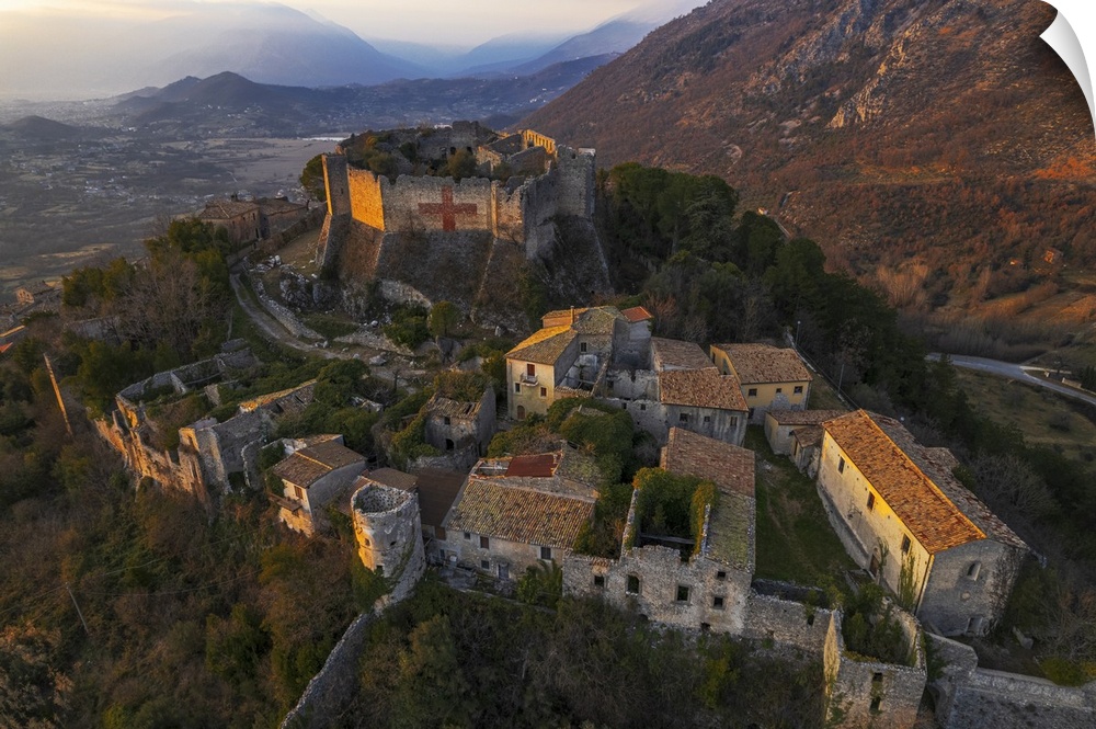 <p>Aerial view of the medieval castle of Vicalvi, with red cross painted on the perimetral wall, overlooking the old village at sunset, Vicalvi, Frosinone province, Ciociaria, Latium region, Lazio, Italy, Europe</p>
