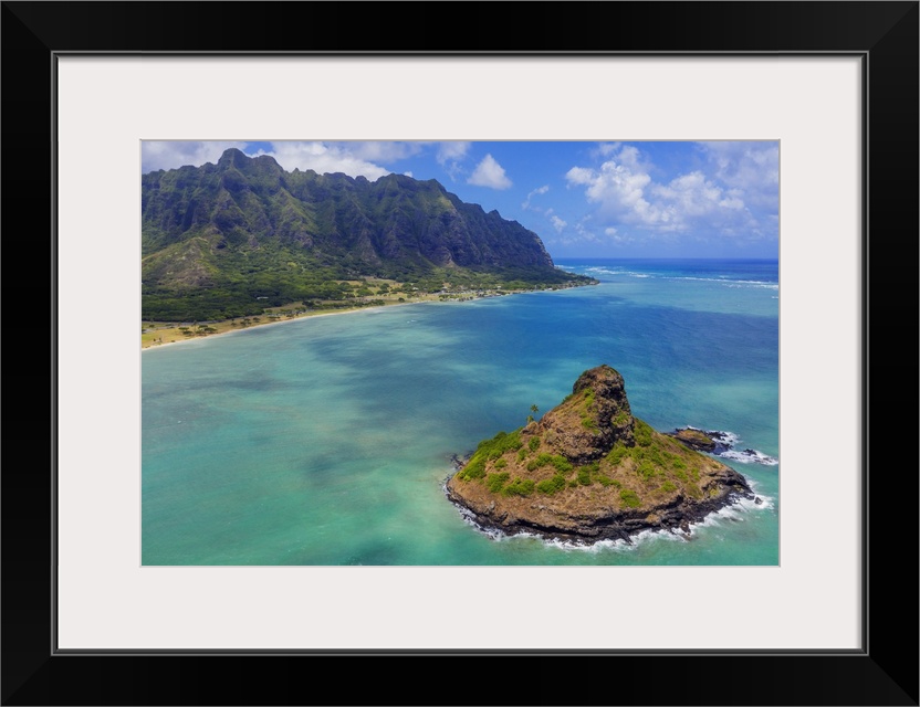<p>Aerial view by drone of Kaneohe Bay and Mokolii island (Chinaman's Hat), Oahu Island, Hawaii, United States of America, North America</p>