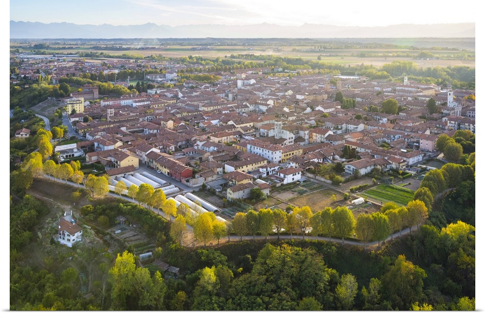 <p>Aerial view Cherasco village from hot air baloon, Cuneo Province, Piedmont, Italy, Europe</p>