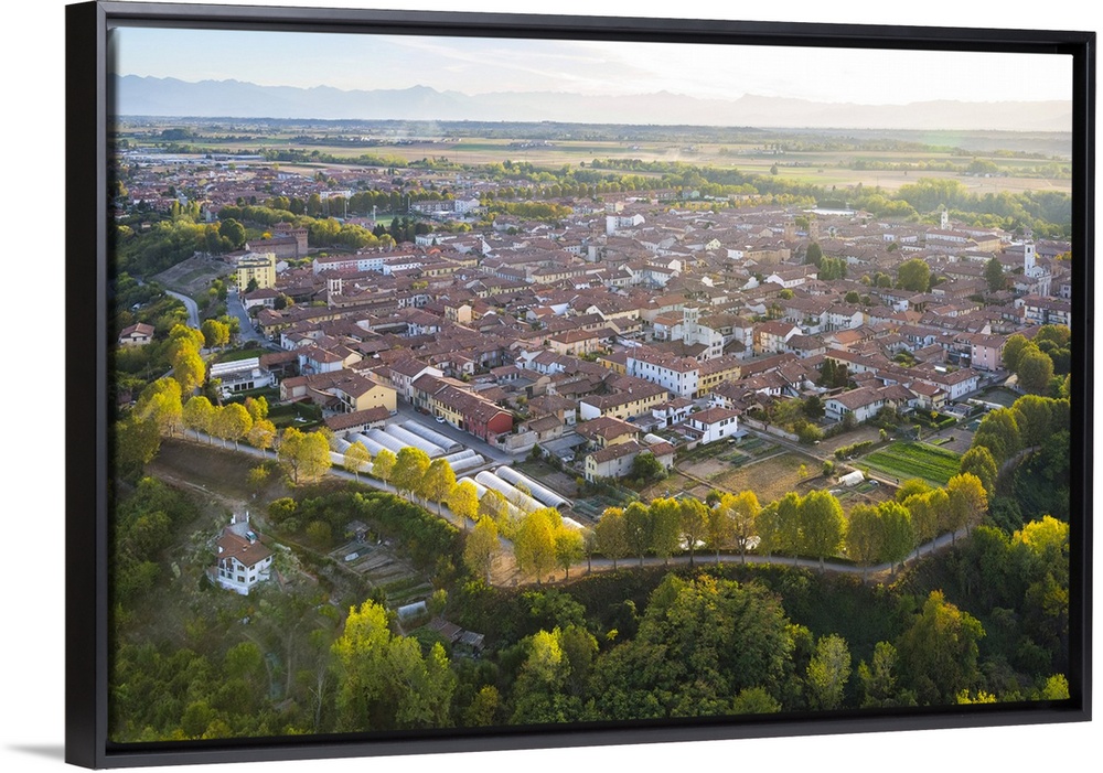 <p>Aerial view Cherasco village from hot air baloon, Cuneo Province, Piedmont, Italy, Europe</p>