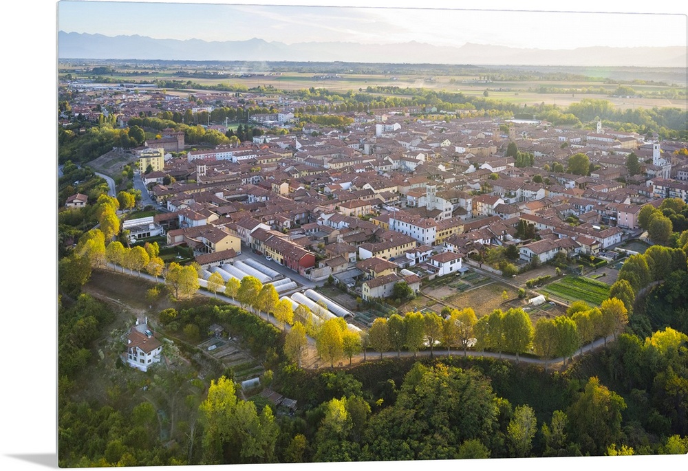 <p>Aerial view Cherasco village from hot air baloon, Cuneo Province, Piedmont, Italy, Europe</p>
