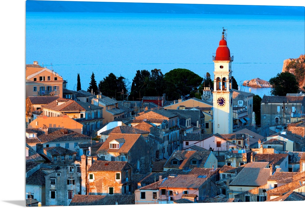 <p>Aerial view from New fortress on the city with St. Spyridon church before sunset, Kerkyra, Corfu island, Greece</p>