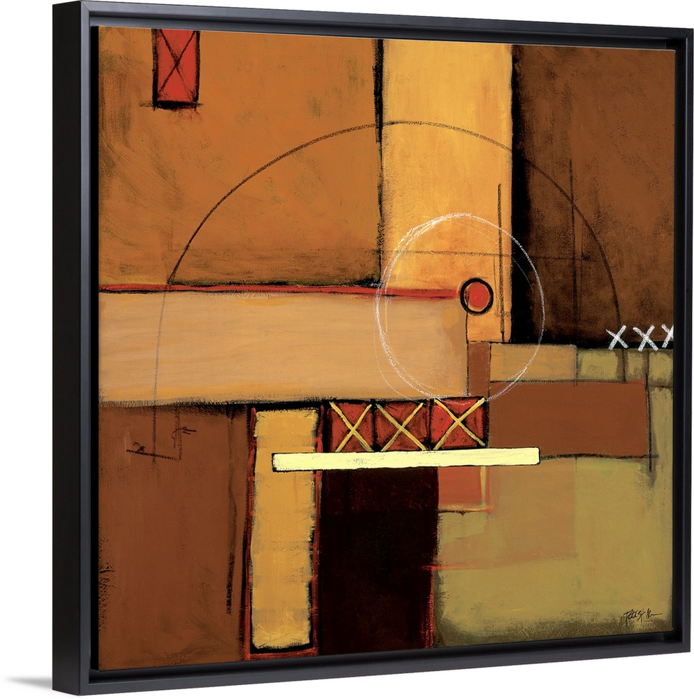 <p>Abstract painting of squared shapes overlapped with circular and "x" elements all done in earth tones.</p>