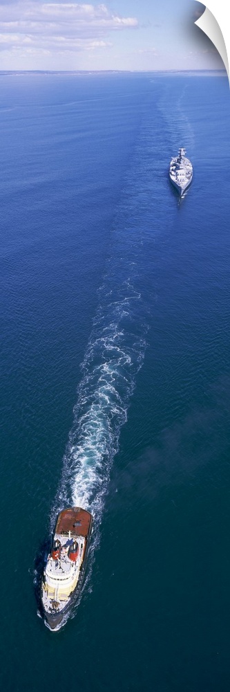<p>Aerial view of a battleship being towed in the sea, USS Iowa (BB-61), Rhode Island, USA</p>