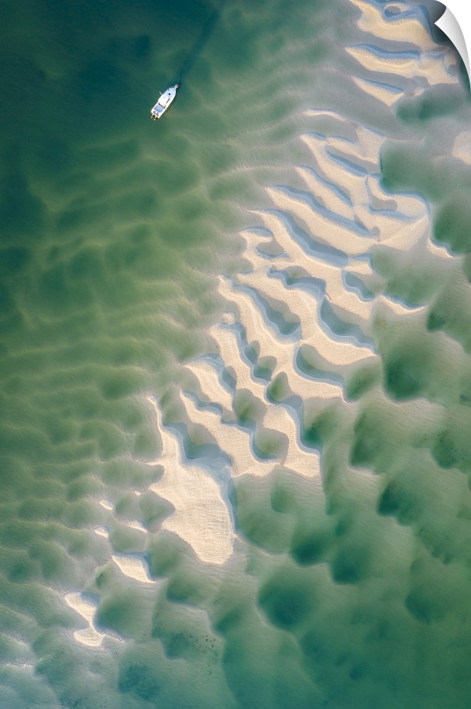 <p>Aerial view of a boat moored on the Camel Estuary at low tide, Rock, Cornwall, England. Summer (July) 2022.</p>
