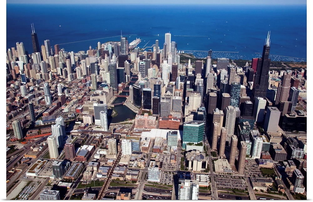 <p>Aerial view of a city, Lake Michigan, Chicago, Cook County, Illinois, USA</p>