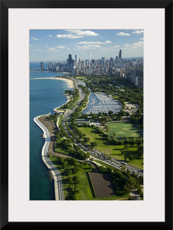 <p>Giant, vertical, aerial photograph of the Lake Michigan shoreline, along Lake Shore Drive in Chicago. The Chicago skyline in the distant background.</p>
