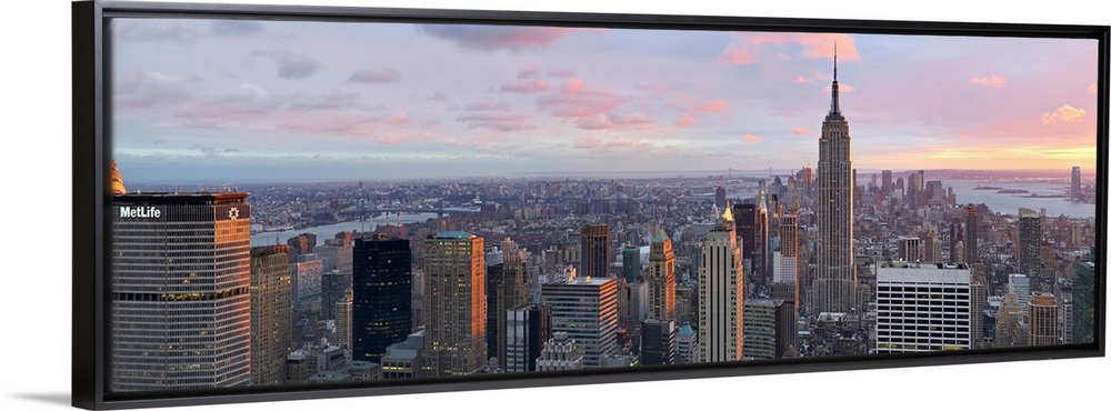 <p>Panoramic canvas of the NYC cityscape seen from above with a beautiful sunset and views of the water in the distance.</p>