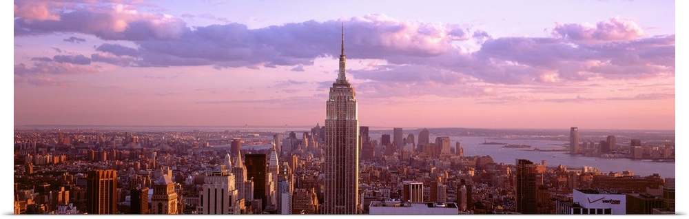 <p>Aerial panoramic picture of New York City and the top of the Empire State Building in the pink glow of the sunset.</p>