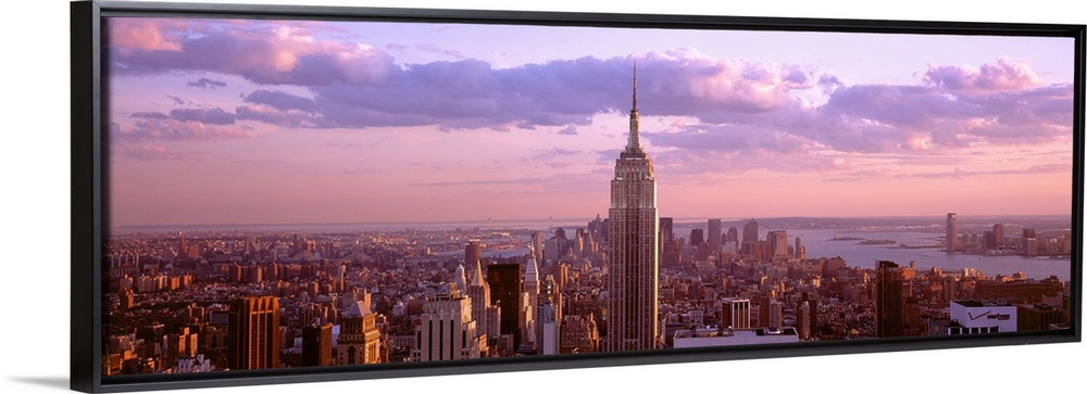 <p>Aerial panoramic picture of New York City and the top of the Empire State Building in the pink glow of the sunset.</p>