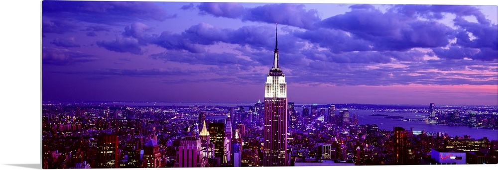 <p>This is a large aerial photograph taken of NYC at dusk with all of the buildings lit and the empire state building towering over the city.</p>
