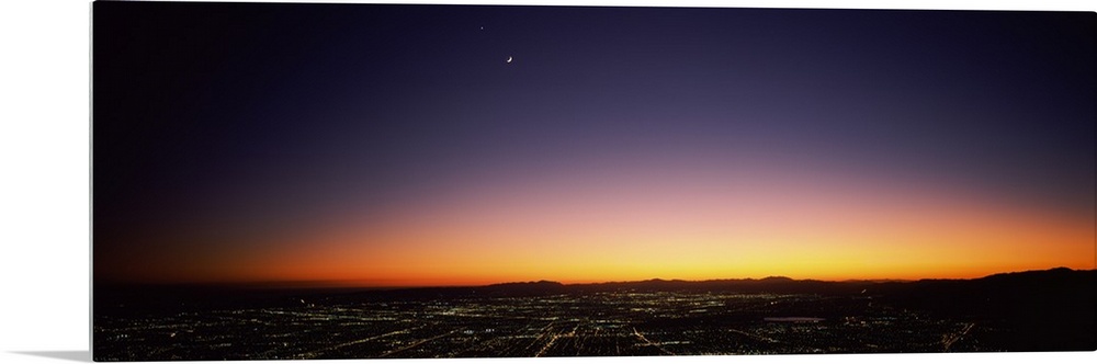 <p>An aerial photograph taken of Los Angeles at night with the sun just setting below the horizon.</p>