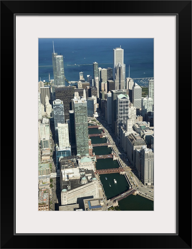 <p>Tall photo print of the Chicago cityscape seen from above with the Chicago River curving through it.</p>