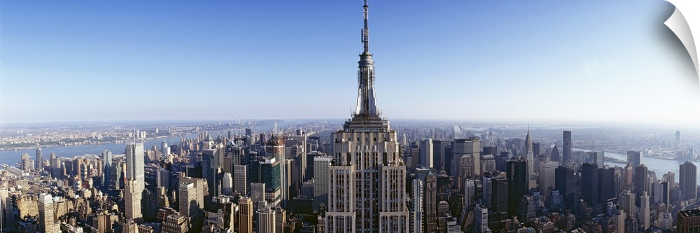 <p>Wide angle, aerial photograph of New York City beneath a blue sky, the Empire State Building in the foreground.</p>