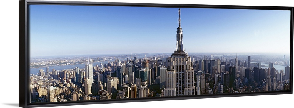<p>Wide angle, aerial photograph of New York City beneath a blue sky, the Empire State Building in the foreground.</p>