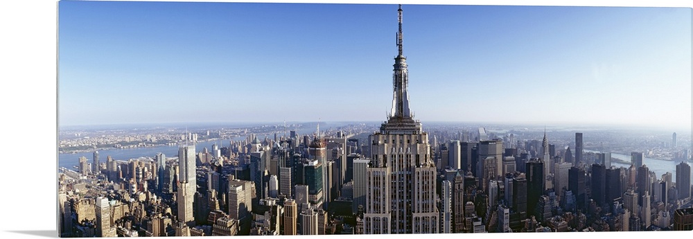 <p>Wide angle, aerial photograph of New York City beneath a blue sky, the Empire State Building in the foreground.</p>