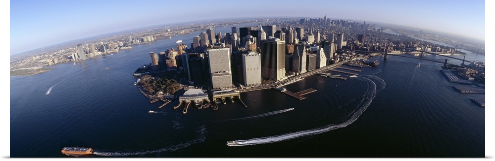 <p>The Manhattan skyline is photographed from an aerial view showing the water that is surrounding it with boats driving around the city.</p>