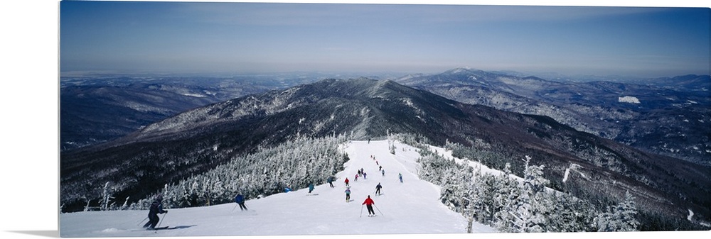 <p>This is a panoramic photograph of skiers heading down a mountain covered with powdery snow in the Appalachian Mountains.</p>