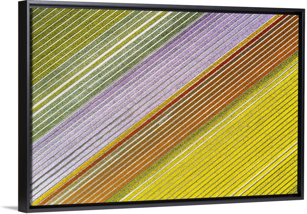 <p>Aerial view of a multicolor tulips field (Warmenhuizen, Schagen municipality, Dutch, North Holland, Netherlands.</p>