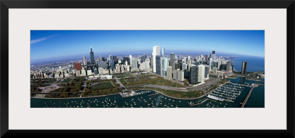 <p>Panoramic photo canvas art of the Chicago cityscape with boats in the harbor seen from above.</p>