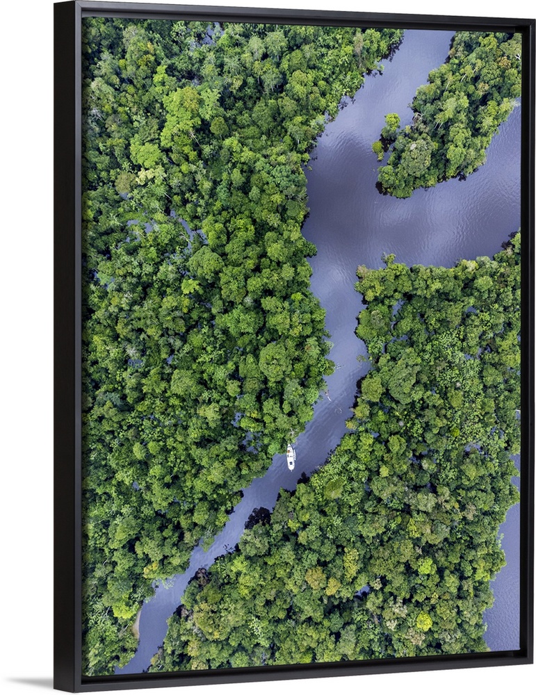 <p>Brazil, Amazonas, Amazon rainforest, Anavilhanas Ecological Station & National Park, Aerial view of a river boat on the Rio Negro river</p>