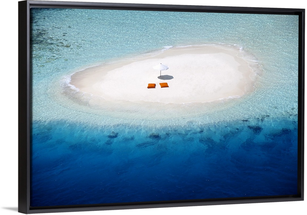<p>Aerial view of a sandbank, pillows and sun umbrella, Maldives, Indian Ocean</p>