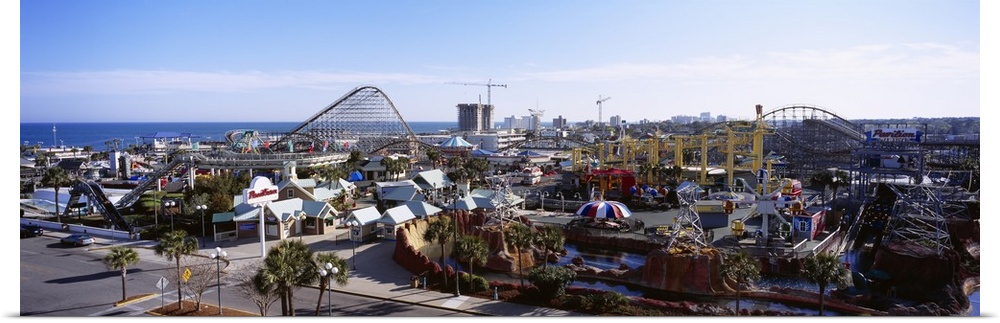 <p>Oversized, aerial landscape photograph of an amusement park with several roller coasters, beneath a blue sky, in Myrtle Beach, South Carolina.</p>