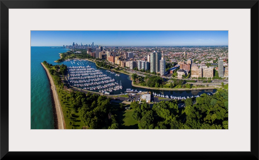 <p>Aerial view of Belmont Harbor and skyline, Chicago, Cook County, Illinois, USA</p>