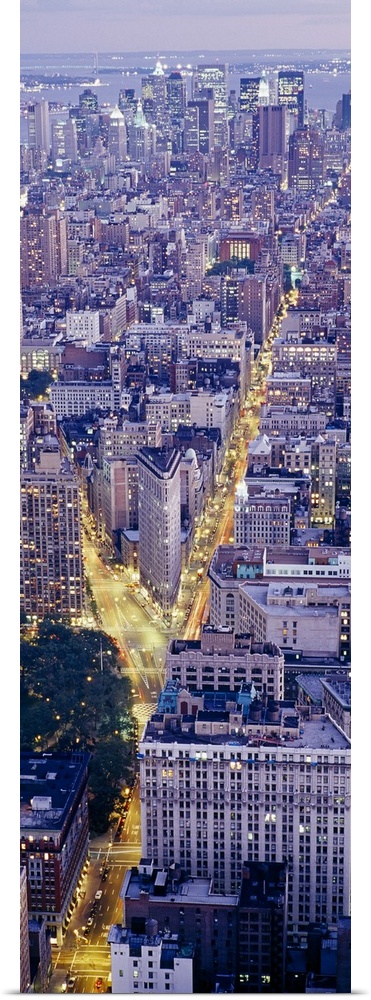 <p>Tall panoramic piece of an aerial photograph taken of the skyline in Manhattan during dusk with the streets illuminated by headlights.</p>