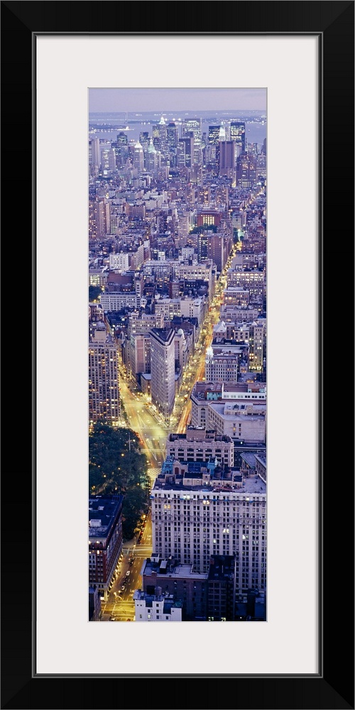 <p>Tall panoramic piece of an aerial photograph taken of the skyline in Manhattan during dusk with the streets illuminated by headlights.</p>