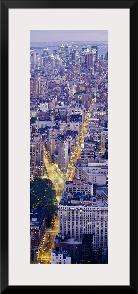 <p>Tall panoramic piece of an aerial photograph taken of the skyline in Manhattan during dusk with the streets illuminated by headlights.</p>