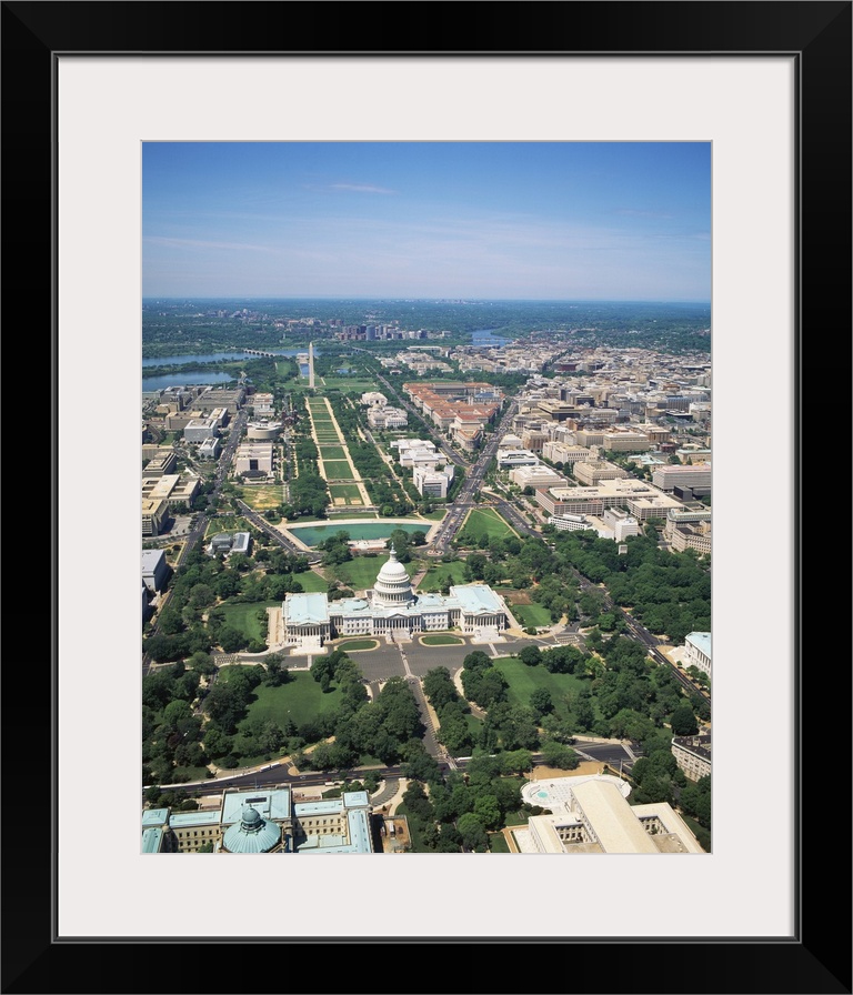 <p>Many of the buildings and monuments in Washington DC are photographed on a bright sunny day from an aerial view.</p>