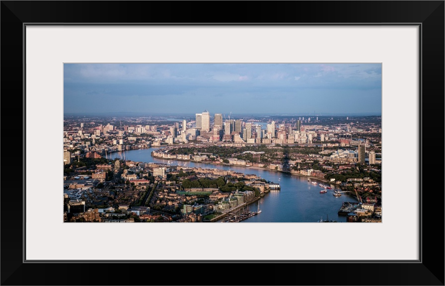 <p>Aerial view of Canary Wharf and River Thames in London, England.</p>