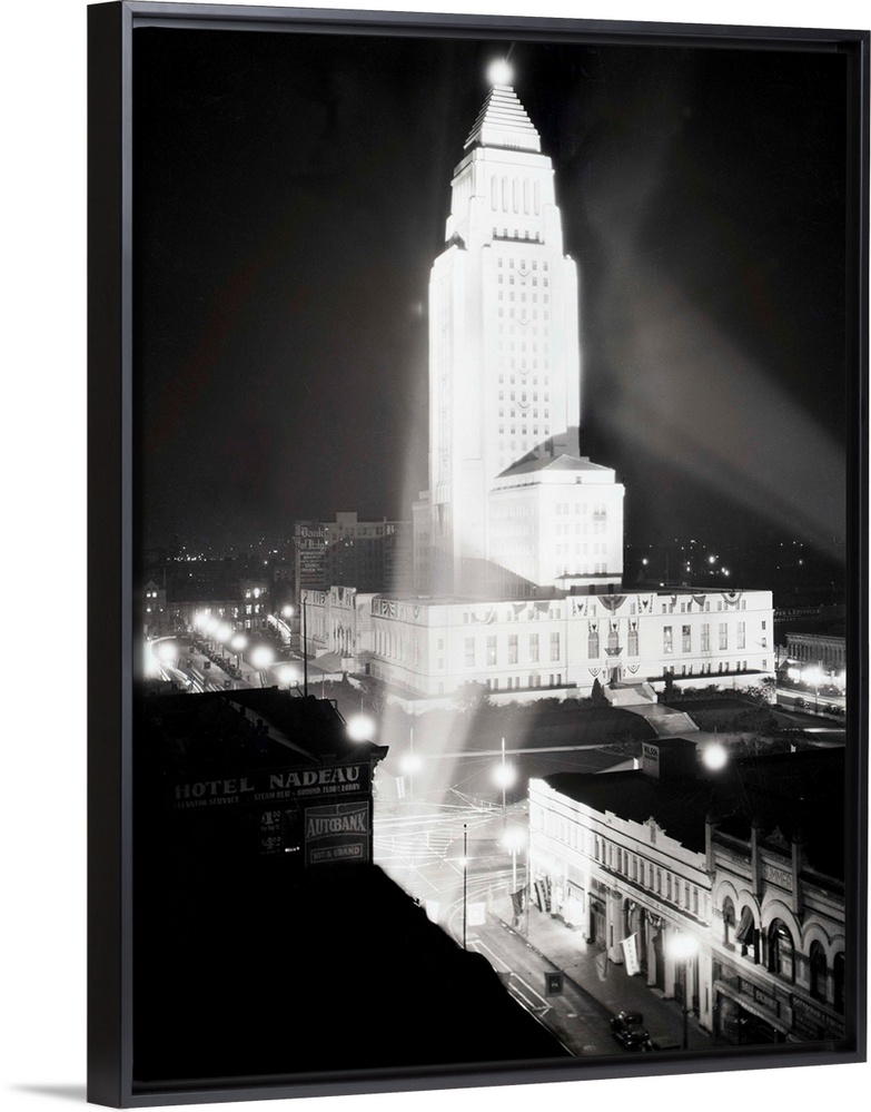 <p>1930-Los Angeles, California: Aerial view of City Hall, at night.</p>