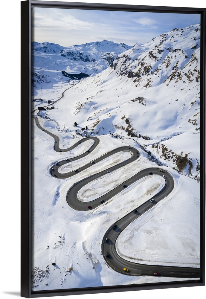 <p>Aerial view of curves of Maloja Pass road, Bregaglia Valley, canton of Graubunden, Engadine, Switzerland.</p>