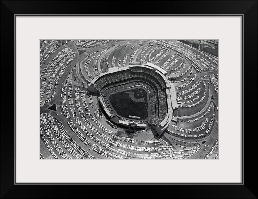 <p>Aerial view shows the new Dodger stadium as their opening day game got under way against Cincinnati before a 56,000 capacity crowd.</p>