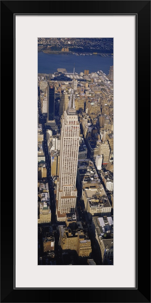 <p>A long vertical picture taken from above the Empire State building which towers over the city surrounding it.</p>