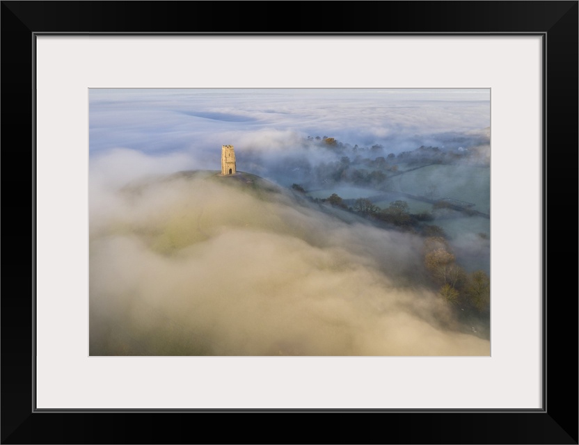 <p>Aerial view of Glastonbury Tor surrounded by morning mist, Glastonbury, Somerset, England</p>