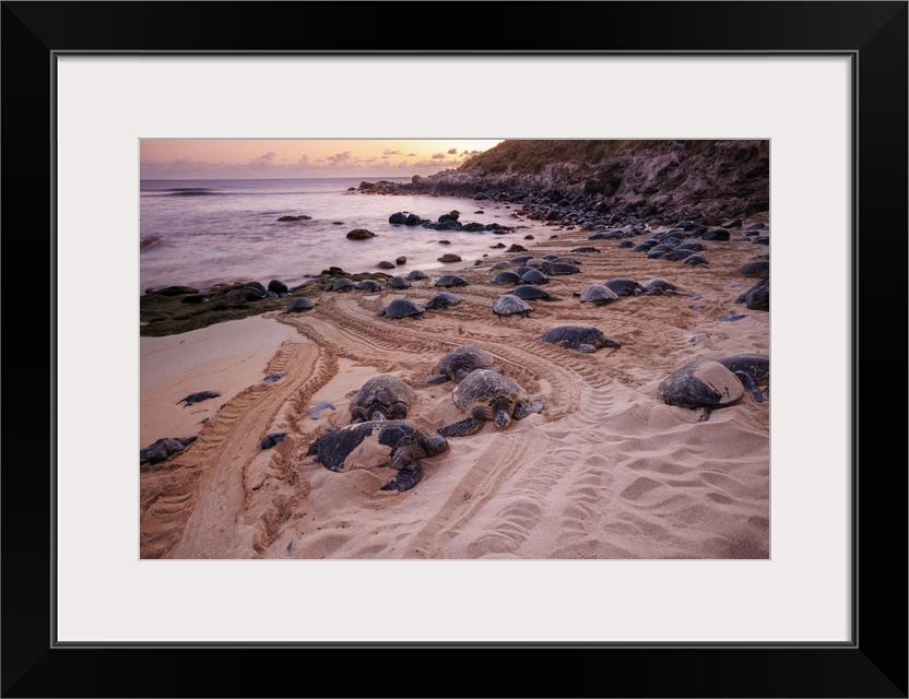 <p>These green sea turtles, Chelonia mydas, an endangered species, have pulled out of the water onto Hoaeokipa Beach on Maui, Hawaii. Photographed at sunrise.</p>