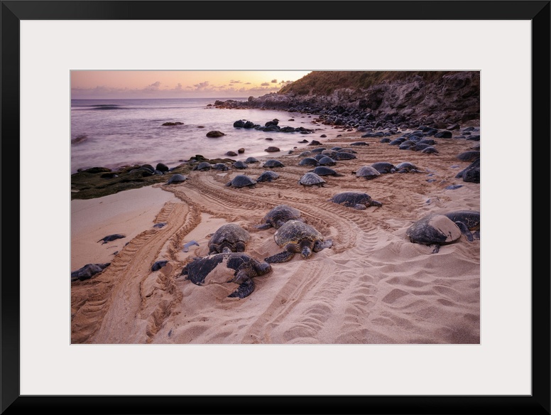 <p>These green sea turtles, Chelonia mydas, an endangered species, have pulled out of the water onto Hoaeokipa Beach on Maui, Hawaii. Photographed at sunrise.</p>