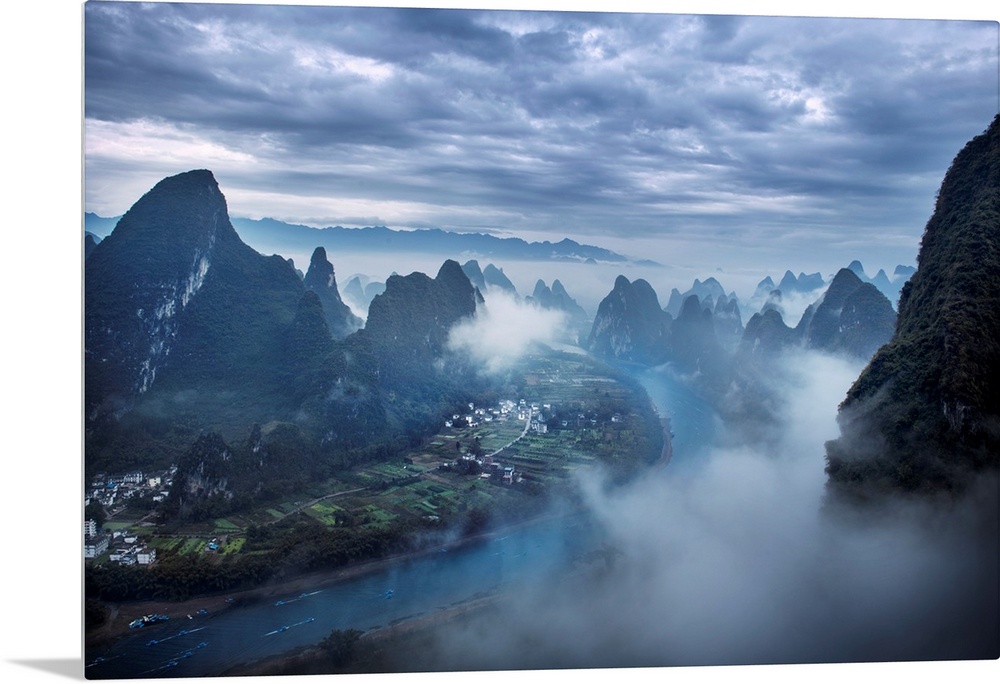 <p>Aerial view of Guilin city, river and mountains in fog, China, Asia.</p>