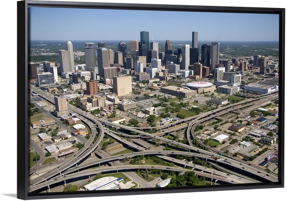 <p>Aerial view of the freeway interchange of Interstate 45 and U.S. Highway 59 in the city of Houston, Texas.</p>