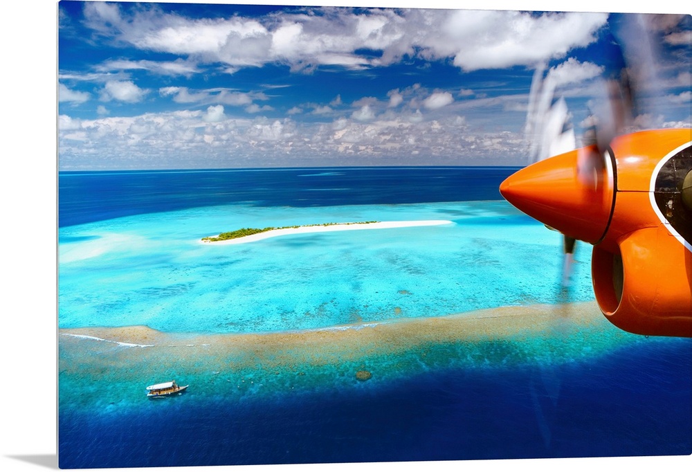 <p>Aerial view of island and seaplane, Male Atoll, The Maldives, Indian Ocean, Asia</p>
