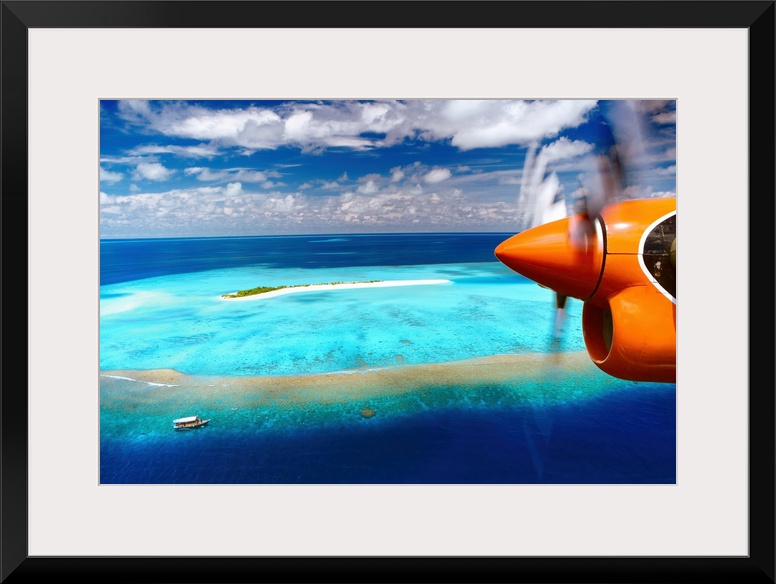 <p>Aerial view of island and seaplane, Male Atoll, The Maldives, Indian Ocean, Asia</p>