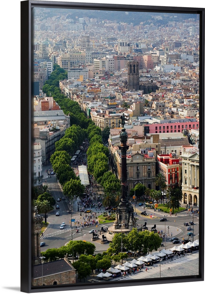 <p>Aerial view of La Rambla near the waterfront with Columbus statue in Barcelona, Spain</p>