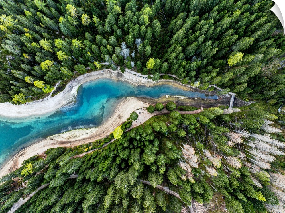 <p>Aerial view of the turquoise colored water of Lake Braies / Pragser Wildsee in a lush autumn forest, Dolomites, South Tyrol, Italy</p>