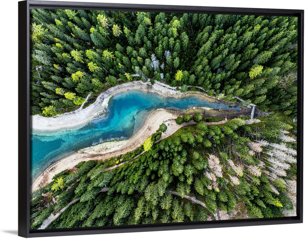 <p>Aerial view of the turquoise colored water of Lake Braies / Pragser Wildsee in a lush autumn forest, Dolomites, South Tyrol, Italy</p>