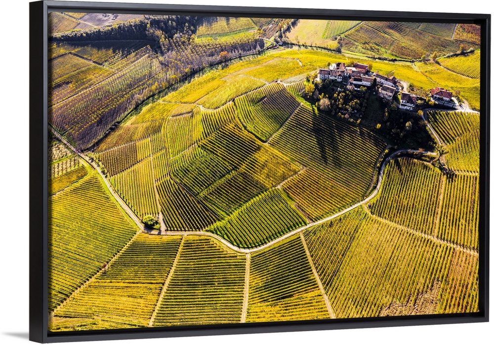 <p>Aerial view of Montestefano village in autumn. Barbaresco region, Piedmont, Italy, Europe.</p>